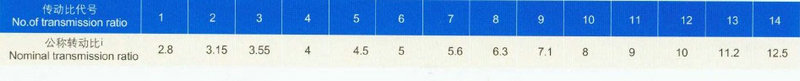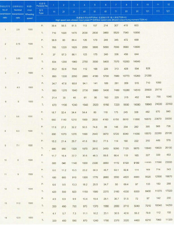 本標準減速器的承載能力受機械強度和熱平衡許用功率兩方面的限制,因此減速器的選用必須通過兩個功率表。首先按減速器機械強度公稱輸入功率P1先用,如果減速器的實用輸入轉(zhuǎn)速與承載能力表中的四檔(1500,1000,750,600)轉(zhuǎn)速之某一檔轉(zhuǎn)速相對誤差不超過4%,可按該檔轉(zhuǎn)速下的公稱功率選用相當規(guī)格的減速器。如果轉(zhuǎn)速相對誤差超過4%,則應按實際轉(zhuǎn)速折算減數(shù)器的公稱功率選用。然后校核減速器熱平衡許用功率。