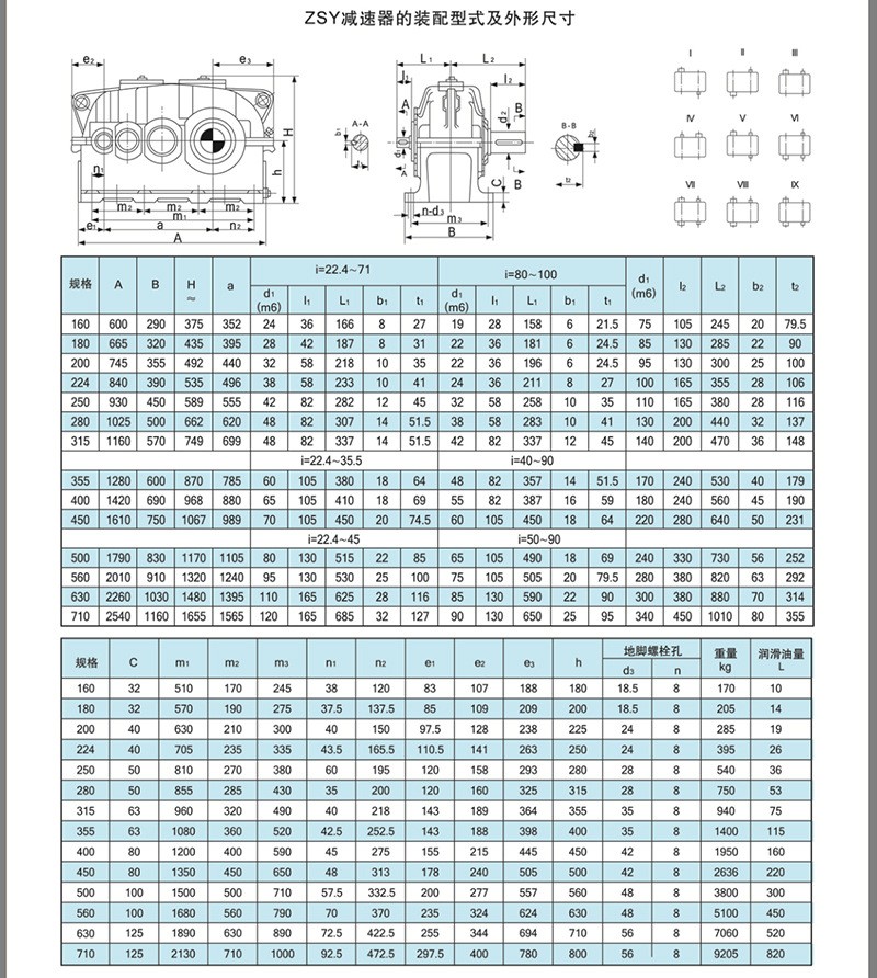 ZSY160減速機(jī),圓柱齒輪減速機(jī)是三級(jí)齒輪減速機(jī),它是平行軸減速器,此類(lèi)減速機(jī)中心距,公稱(chēng)傳動(dòng)比等主要參數(shù)均經(jīng)優(yōu)化設(shè)計(jì),主要零、部件互換性好,齒輪均采用優(yōu)質(zhì)合金鋼經(jīng)滲碳、淬火而成,齒面硬度達(dá)54-62HRC,該產(chǎn)品體積小,重量輕,精度高,噪音低,一般采用油池潤(rùn)滑,自然冷卻,工作環(huán)境溫度為-40+50度,如果低于0度,啟動(dòng)前潤(rùn)滑油應(yīng)預(yù)熱至0度以上,本減速器可用于正反兩個(gè)方向運(yùn)轉(zhuǎn)。ZSY圓柱齒輪減速機(jī)有22.4,25,28,31.5,35.5,40,45,50,56,63,71,80,90,100十四種傳動(dòng)比,九種安裝方式