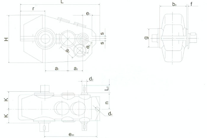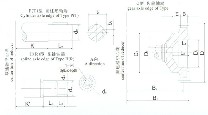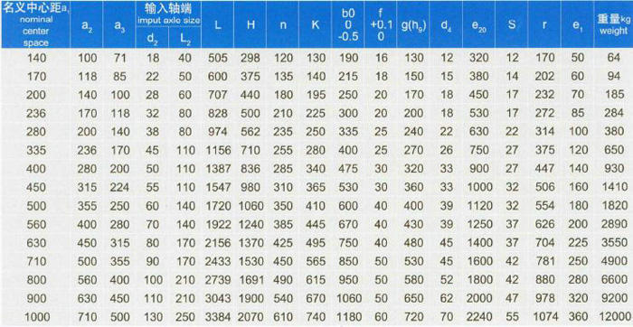 標記示例:起重機減速器三級傳動,名義中心距a1=560mm公稱傅動比50, 裝配型式第III種,輸出軸為齒輪軸端,臥式安裝則標記為:減速器QJS560-50-III-cw.